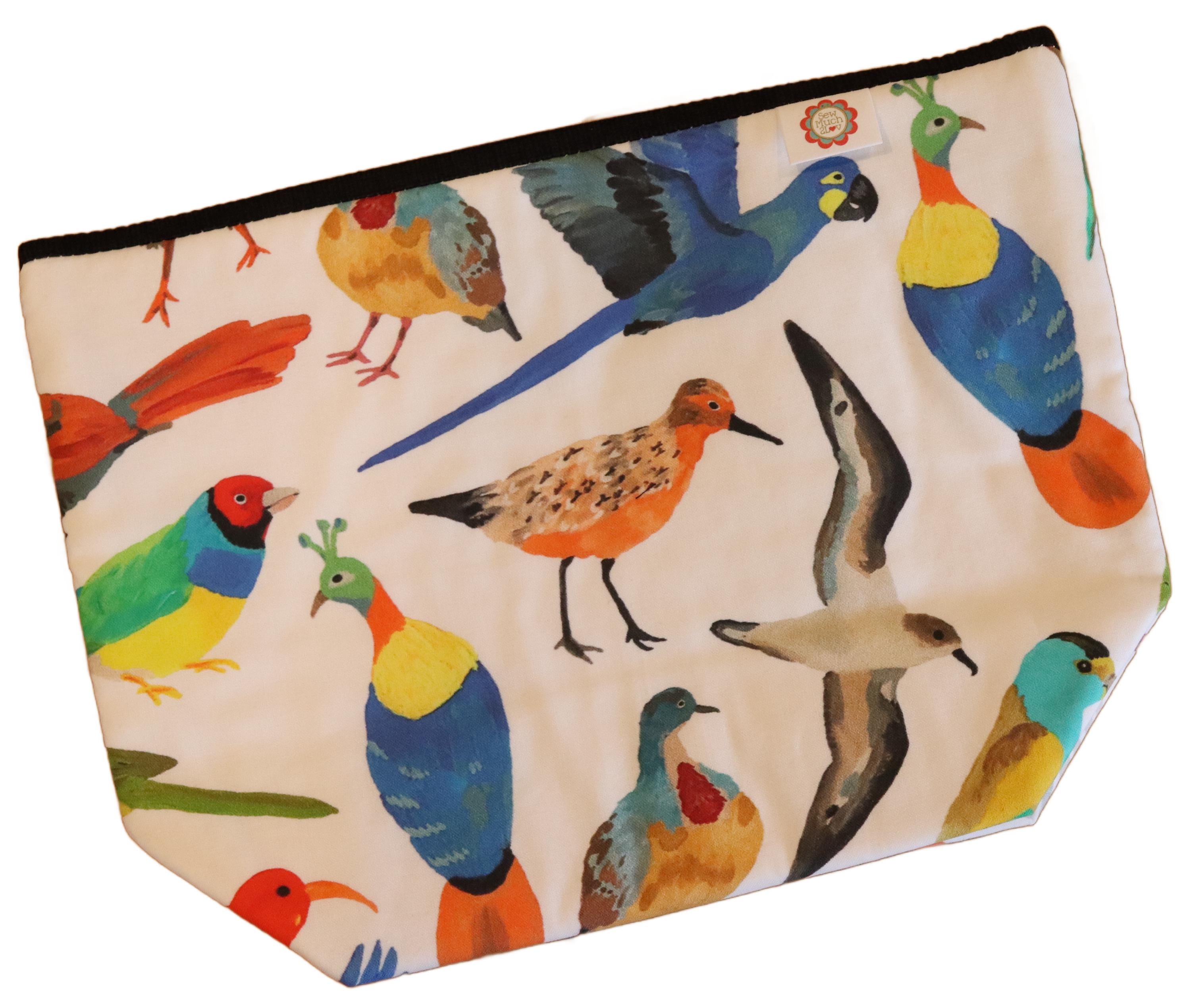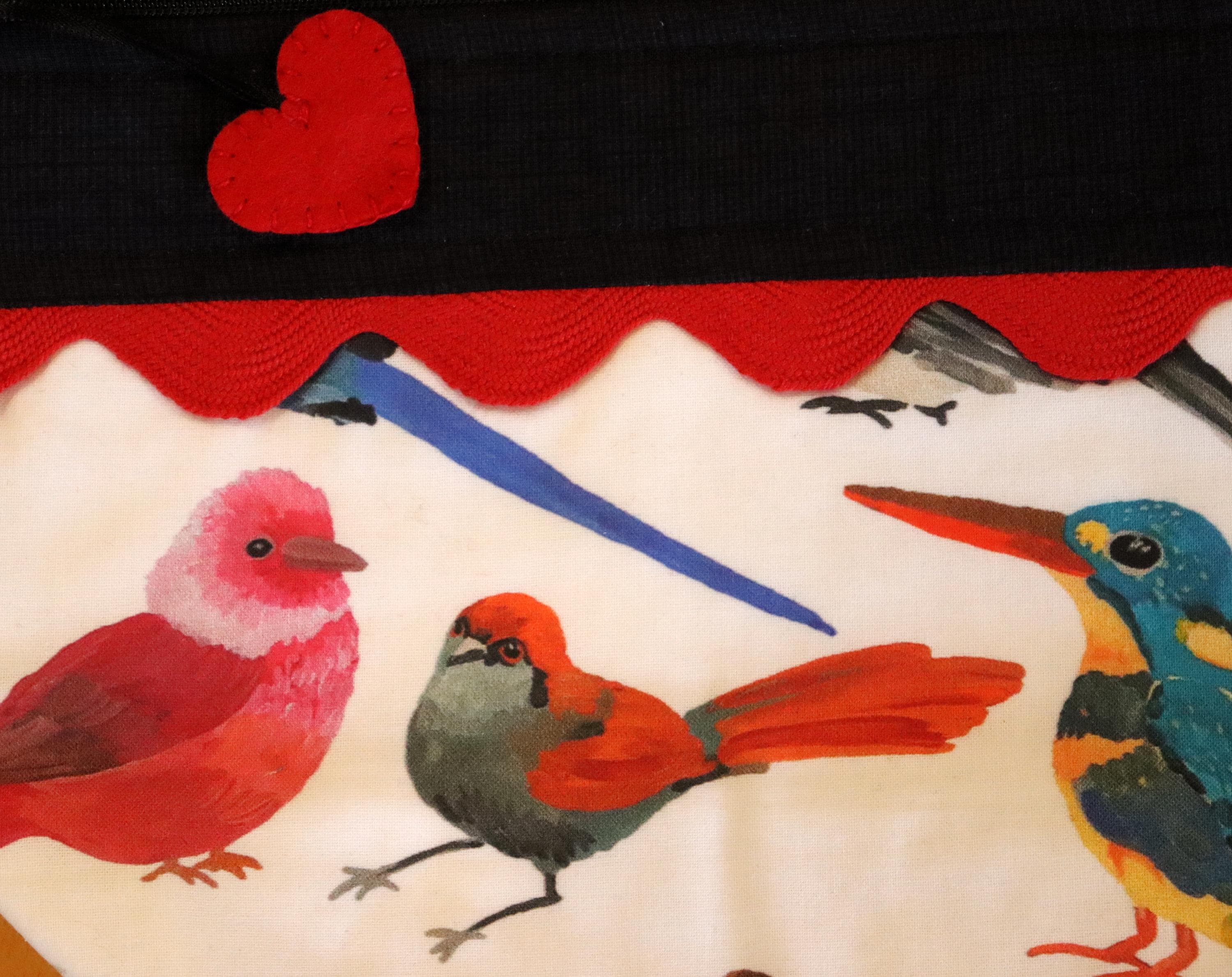 This is the smaller version of the Big Bottom Bag. The bag measures 11 1/2" wide and is 10" tall. It can comfortably hold an 8" hoop or 8 x 8" Qsnap as well as your supplies for those smaller projects.These bags are perfect for projects to take along with you as well as all kinds of crafts that you want to keep clean and away from sticky fingers or curious pets. These bags are padded and fully lined. Each one has a hand stitched wool felt heart for the zipper pull.