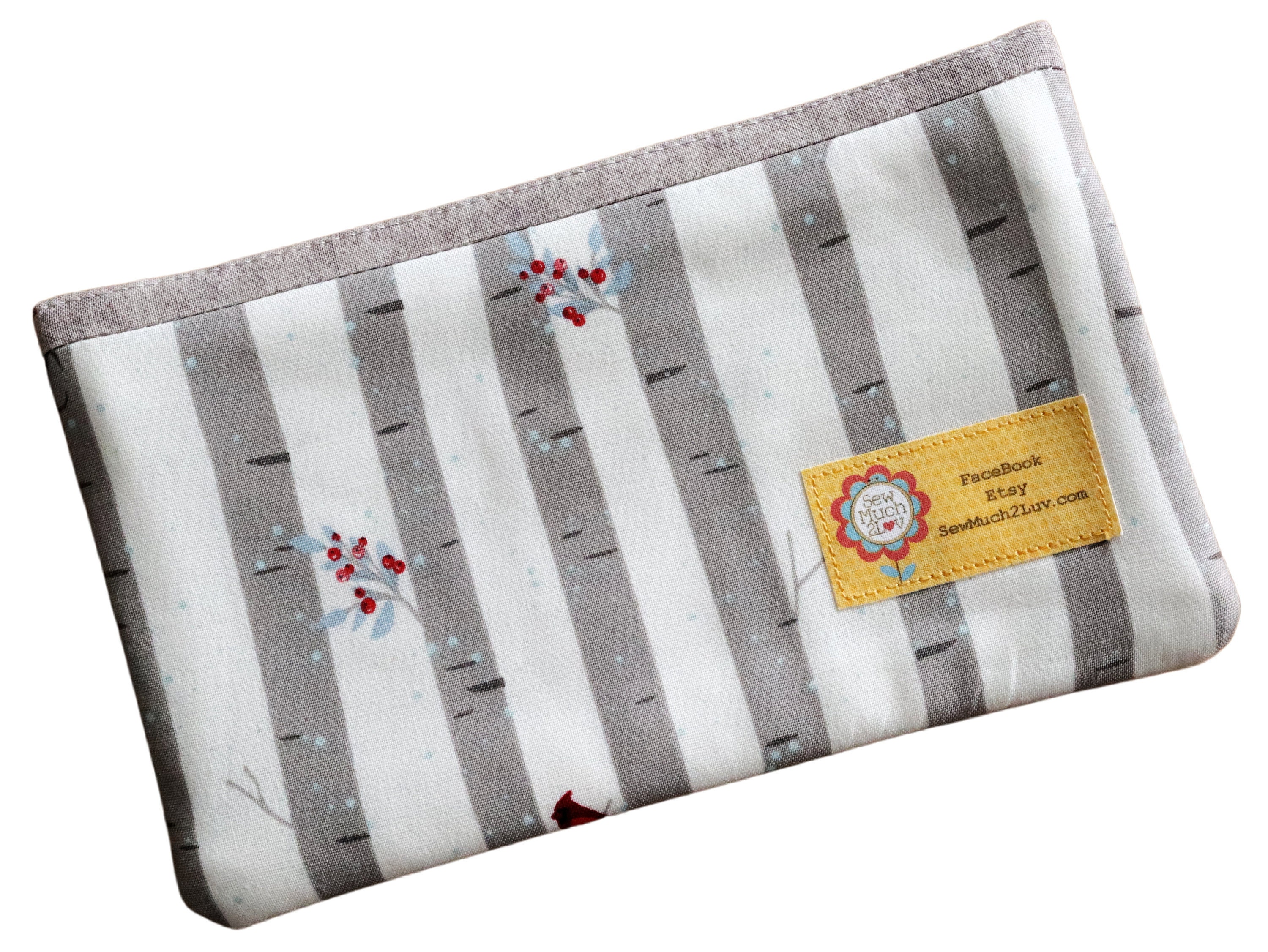 These cute little zipper bags measure approximately 7 1/2" wide by 4 1/2" tall and are a great size to hold your scissors, needles, floss and accessories. They also make great make-up bags.