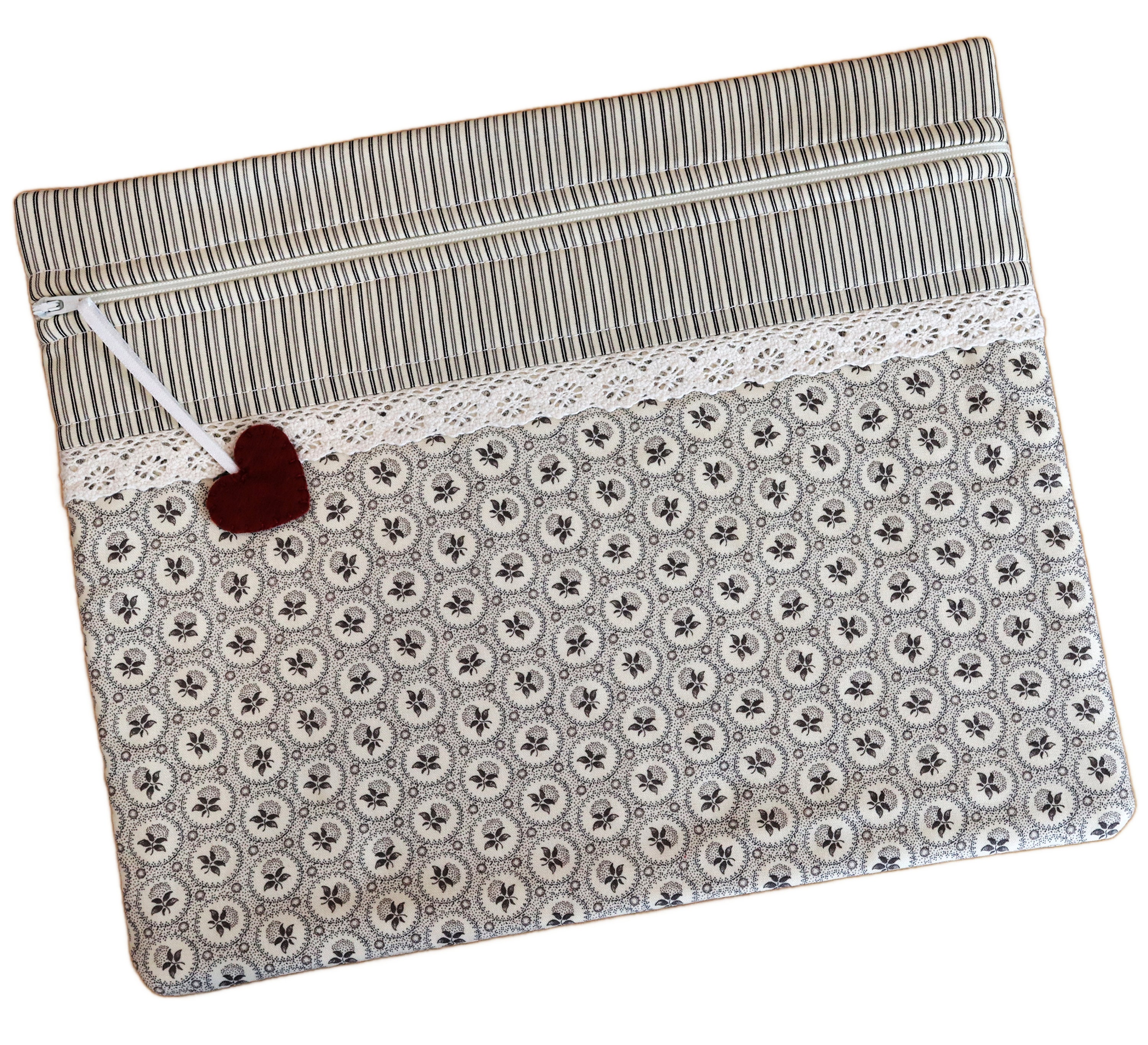 These bags are perfect for projects to take along with you as well as all kinds of crafts that you want to keep clean and away from sticky fingers or curious pets. They measure 10.5" by 13" and are padded and fully lined. Each one has a hand stitched wool felt heart for the zipper pull.