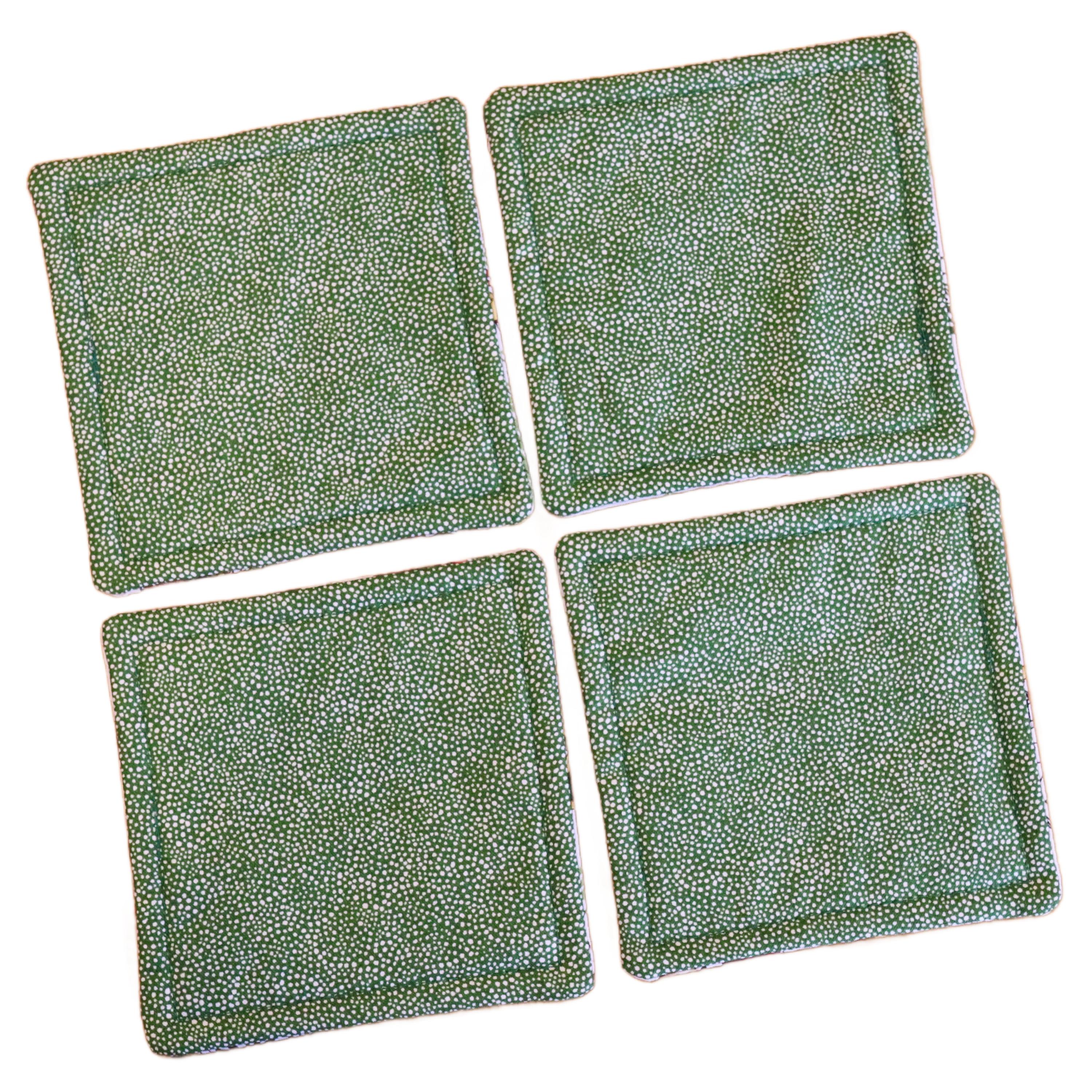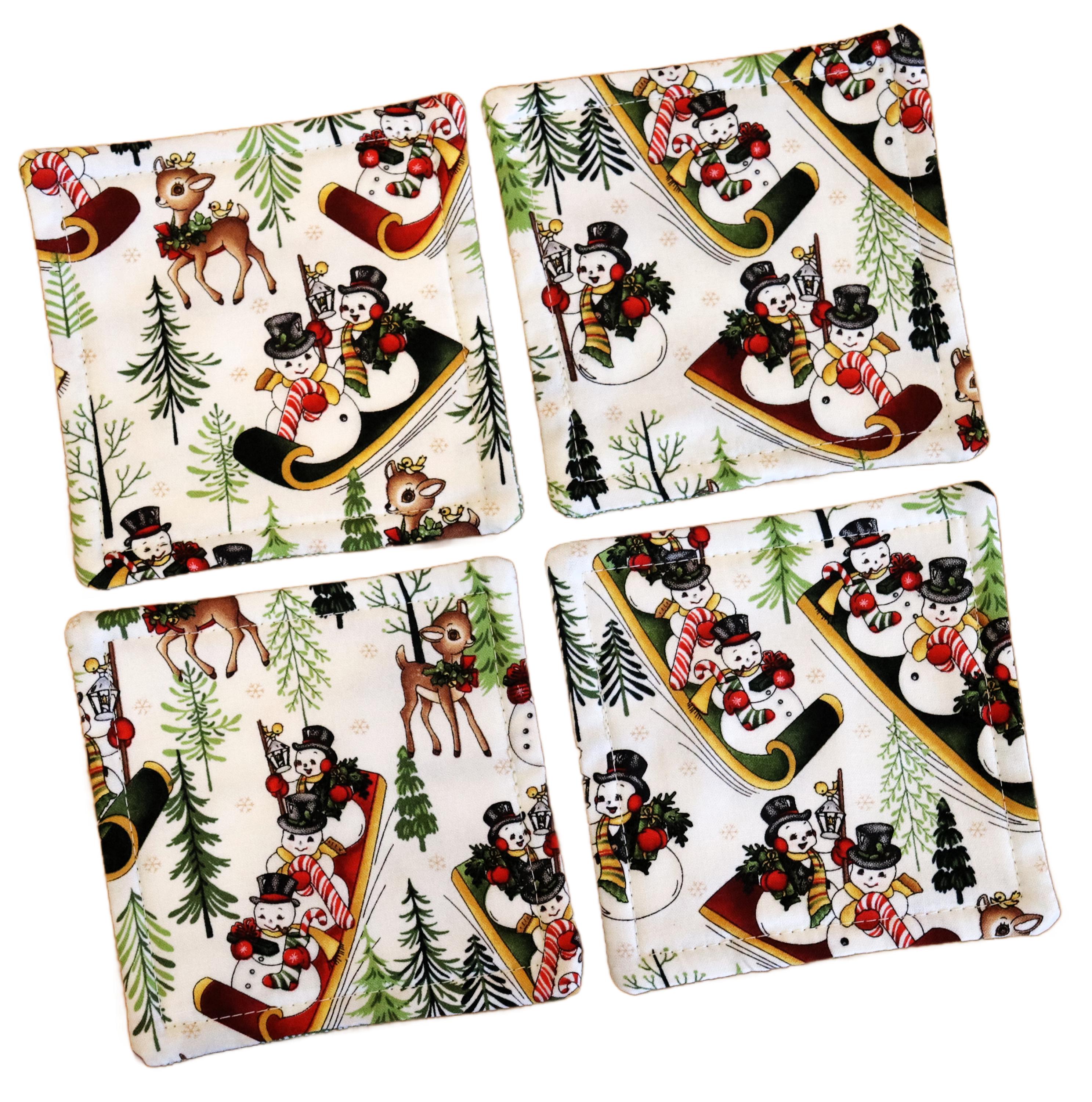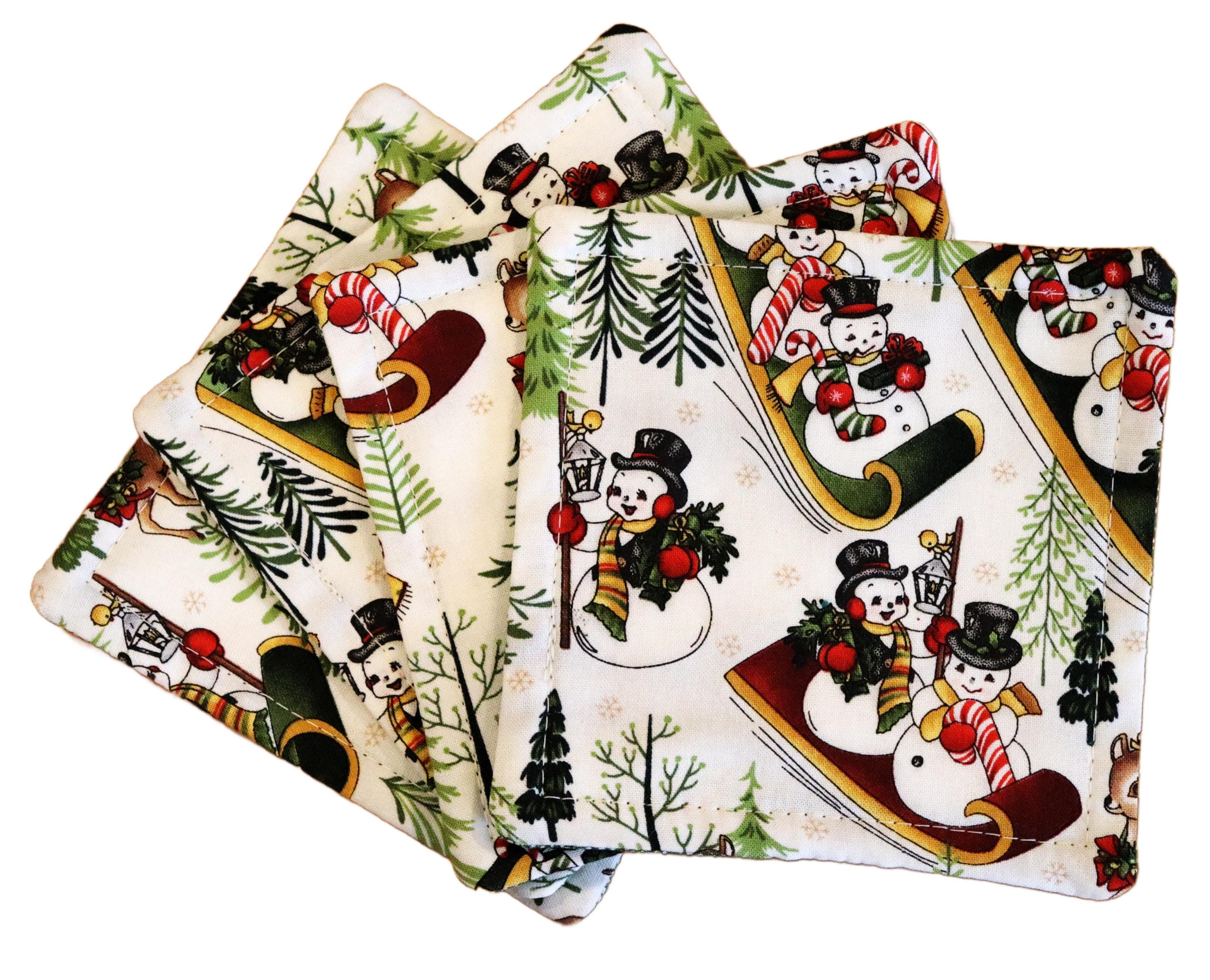 These beautiful set of 4 coasters are made with cotton fabric with Sledding Snowmen and backed with green and white dots. These coasters measure 4 1/2" by 4 1/2". They are lined with Warm & Natural batting and are quilted to be absorbent. These make lovely stocking stuffers or a wonderful hostess gift for those upcoming holiday parties. Machine wash & dry. Press with iron if necessary.