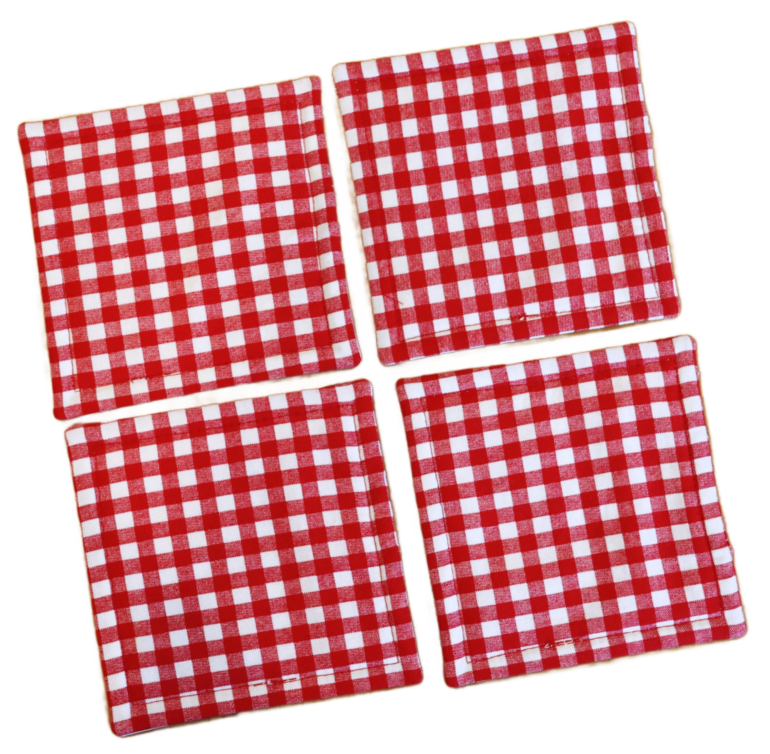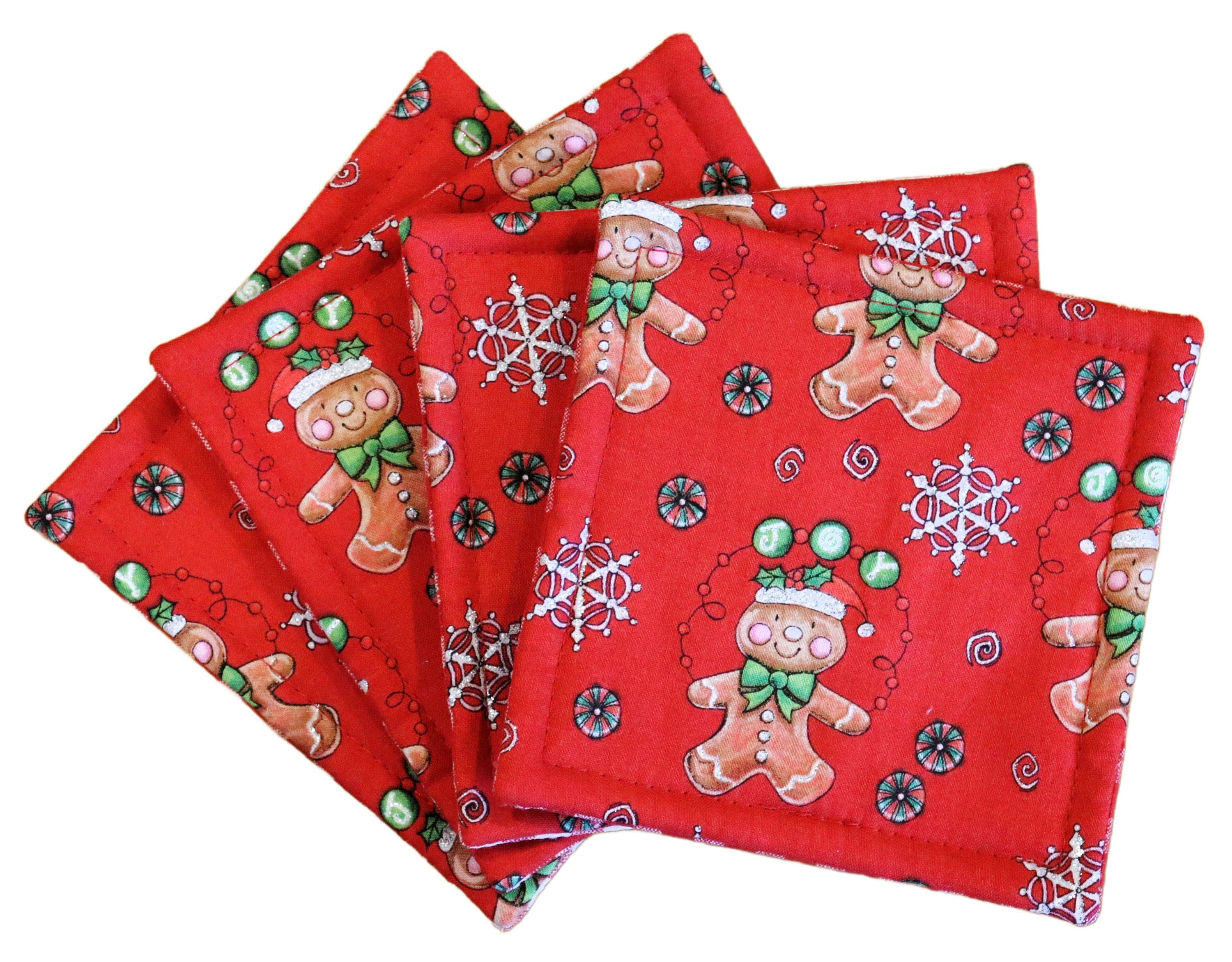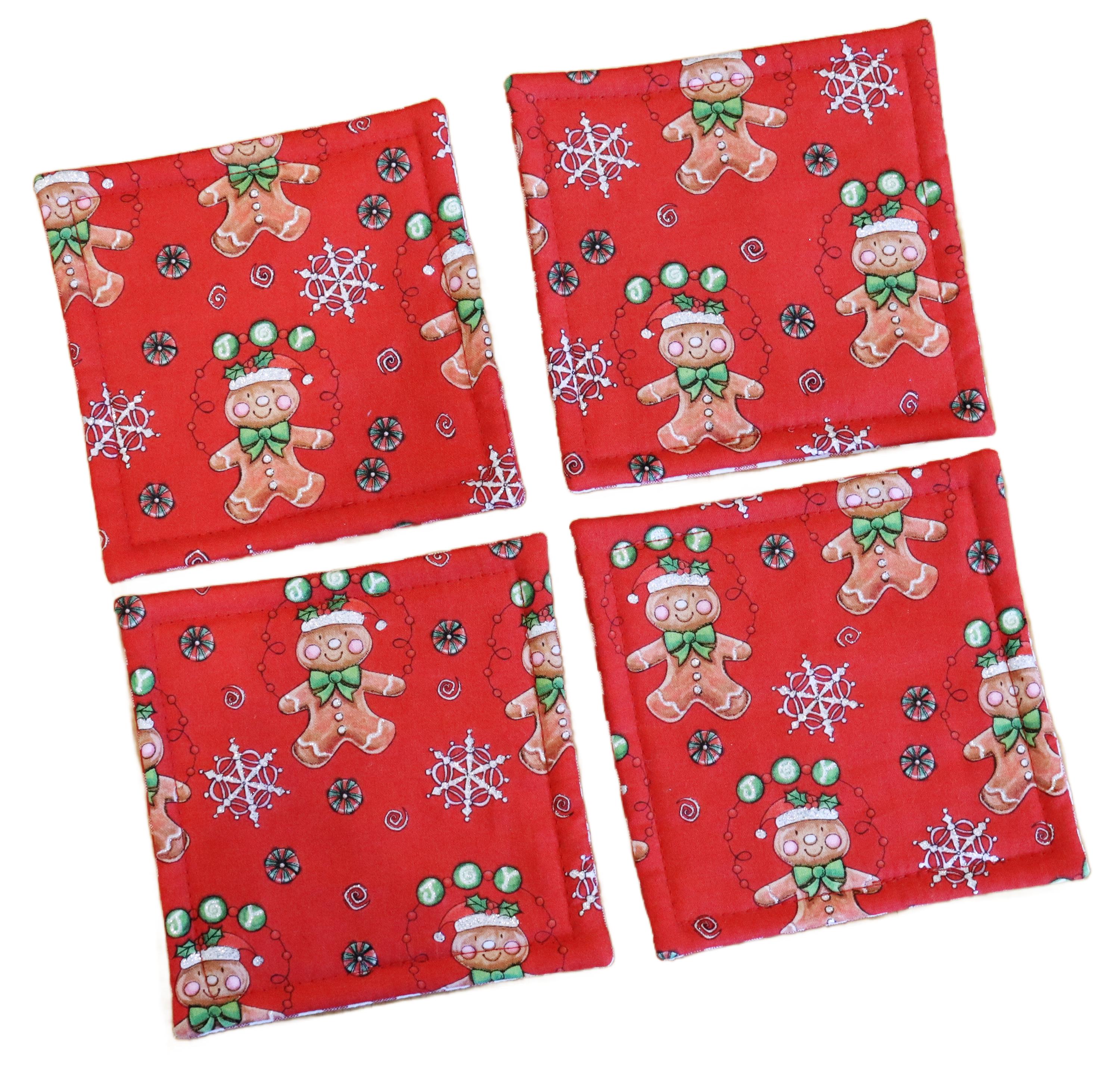These beautiful set of 4 coasters are made with cotton fabric with Glittery Gingerbread man and backed with red and white gingham. These coasters measure 4 1/2" by 4 1/2". They are lined with Warm & Natural batting and are quilted to be absorbent. These make lovely stocking stuffers or a wonderful hostess gift for those upcoming holiday parties. Machine wash & dry. Press with iron if necessary.