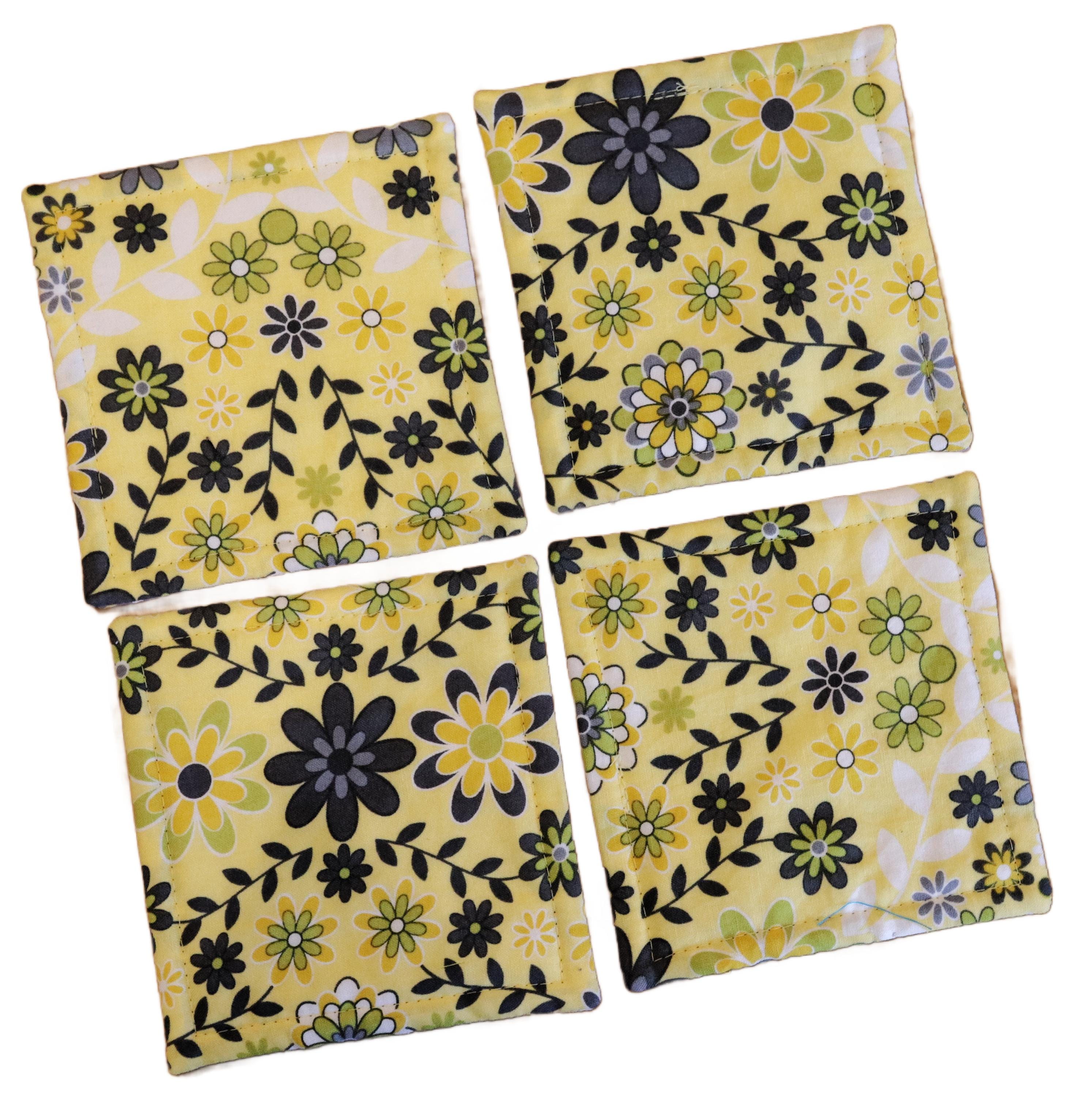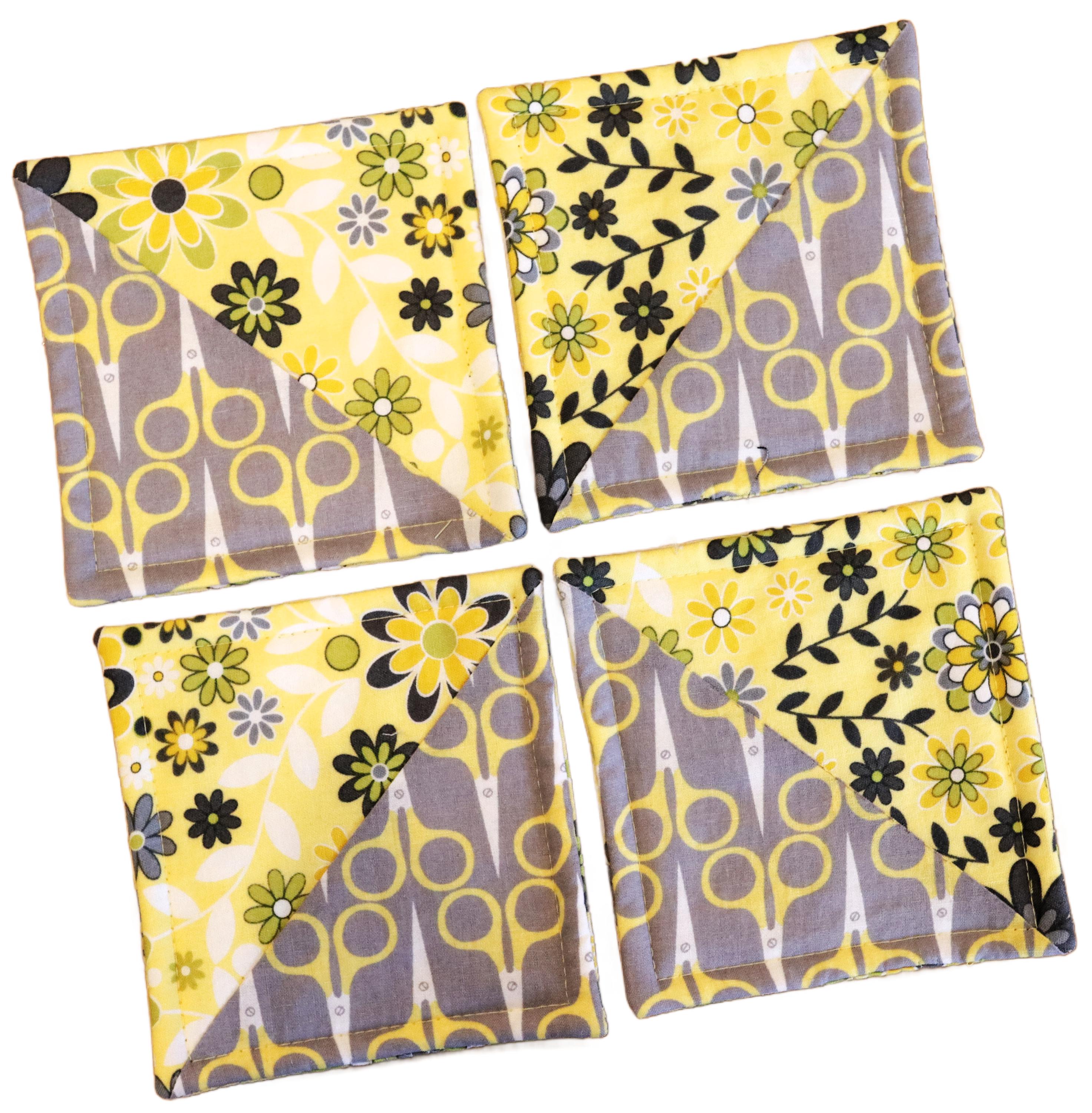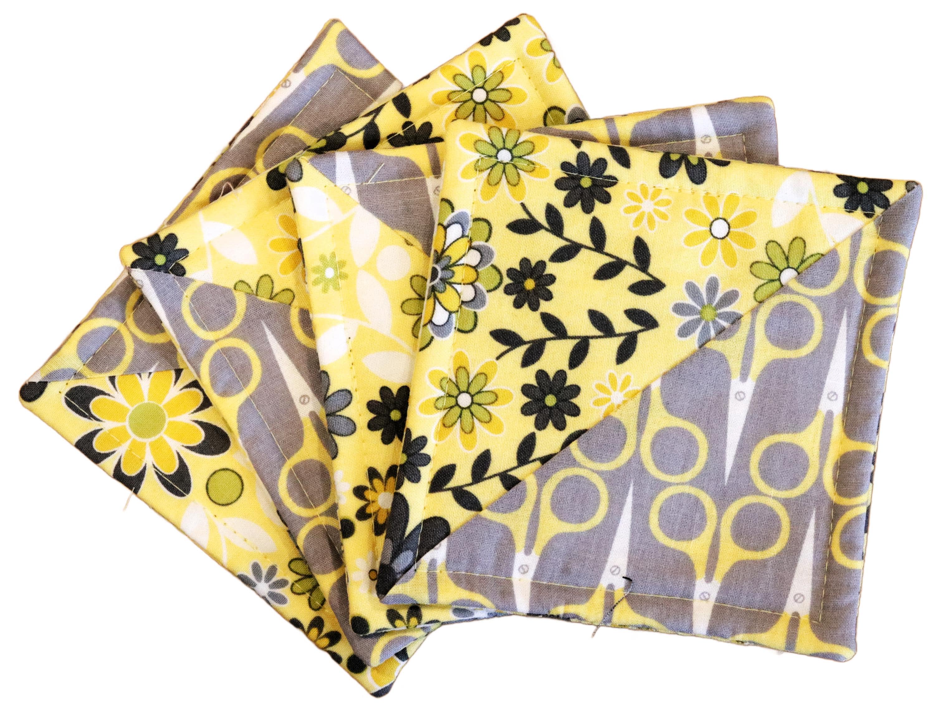 These beautiful set of 4 coasters are made with cotton fabric with Gray and Yellow Scissors and Flowers and backed with gray and yellow floral. These coasters measure 4 1/2" by 4 1/2". They are lined with Warm & Natural batting and are quilted to be absorbent. These make lovely stocking stuffers or a wonderful hostess gift for those upcoming holiday parties. Machine wash & dry. Press with iron if necessary.