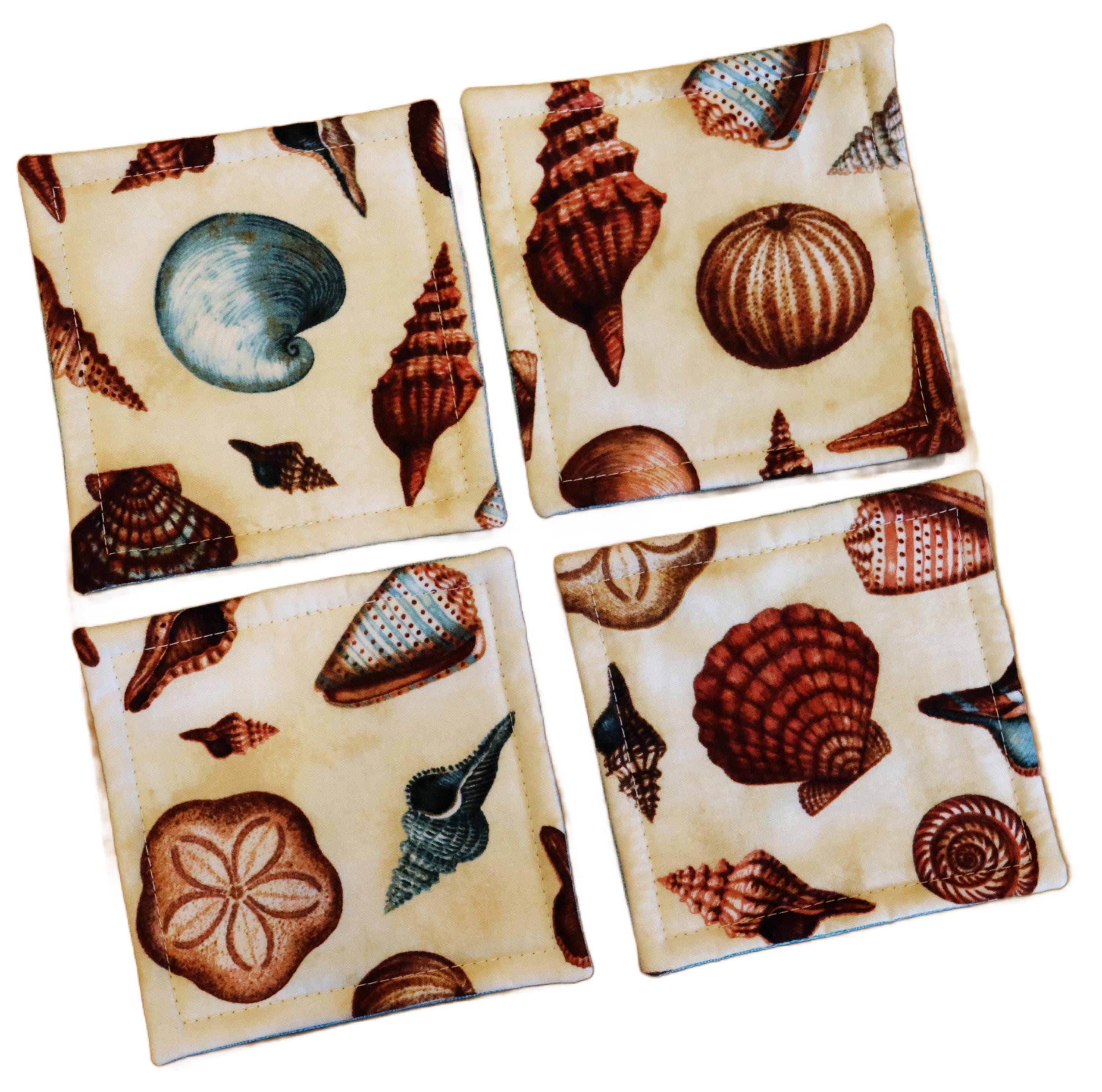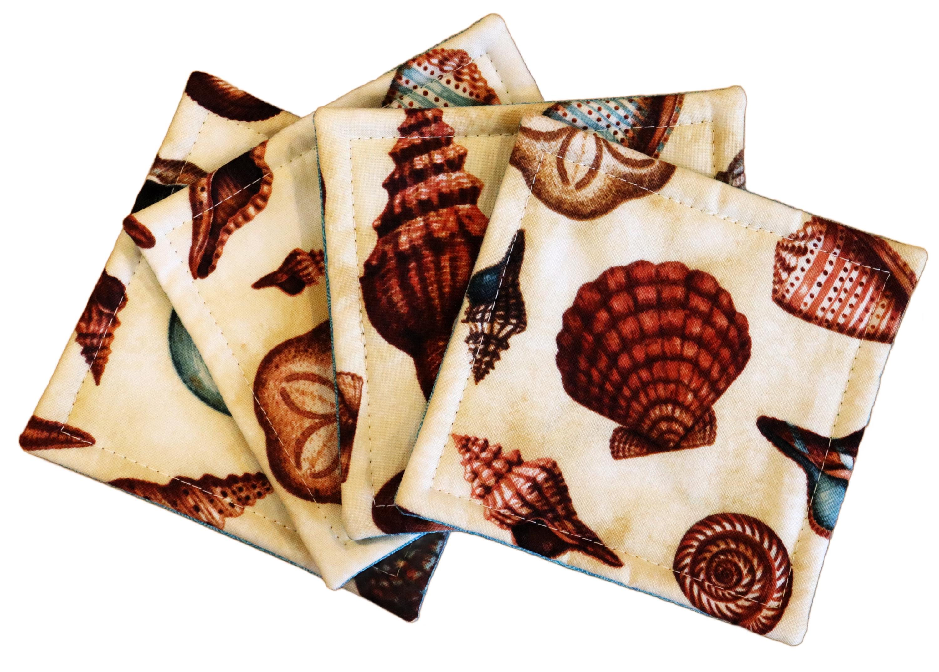 These beautiful set of 4 coasters are made with cotton fabric with Sea Shells and backed with teal swirls. These coasters measure 4 1/2" by 4 1/2". They are lined with Warm & Natural batting and are quilted to be absorbent. These make lovely stocking stuffers or a wonderful hostess gift for those upcoming holiday parties. Machine wash & dry. Press with iron if necessary.