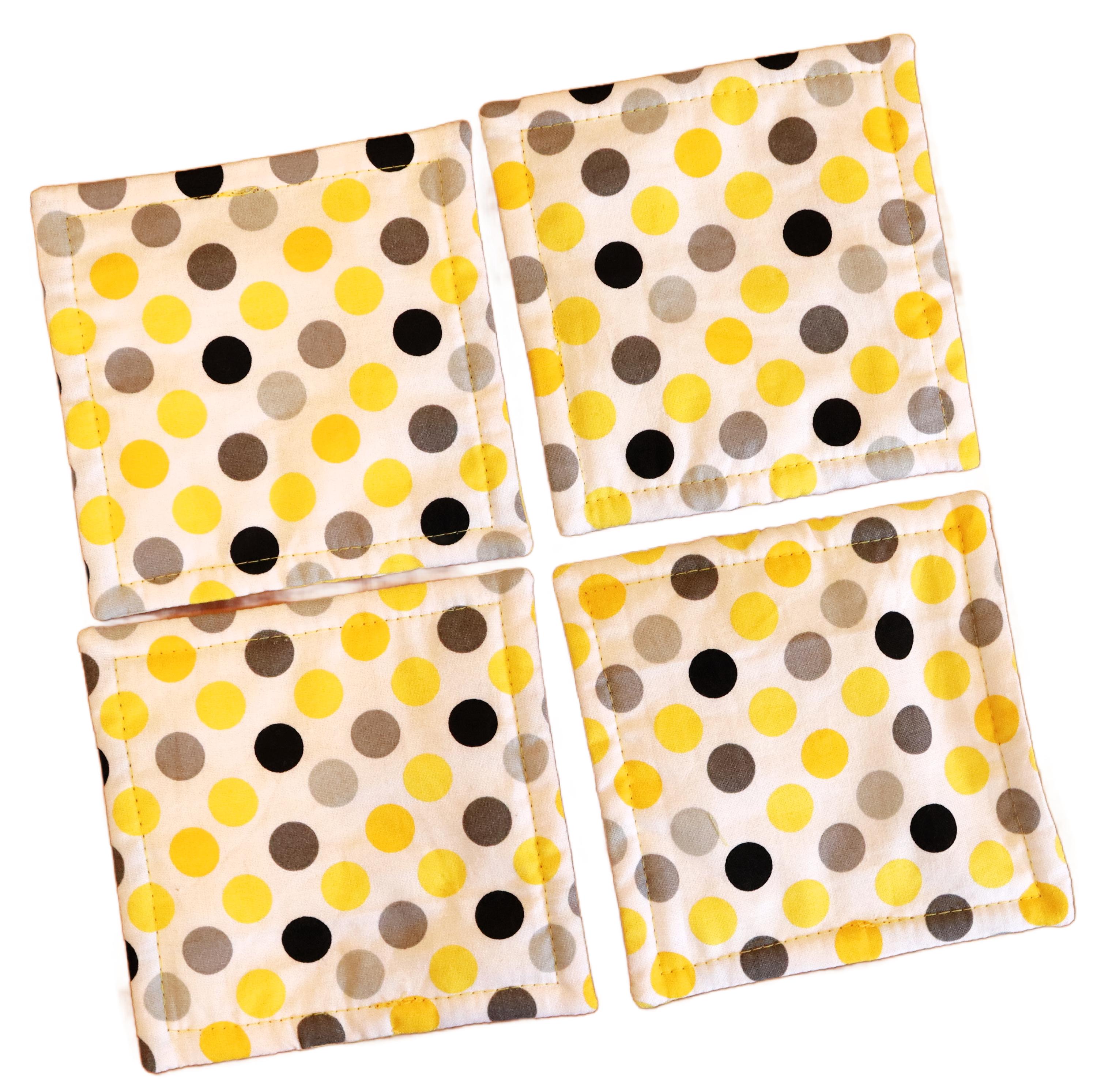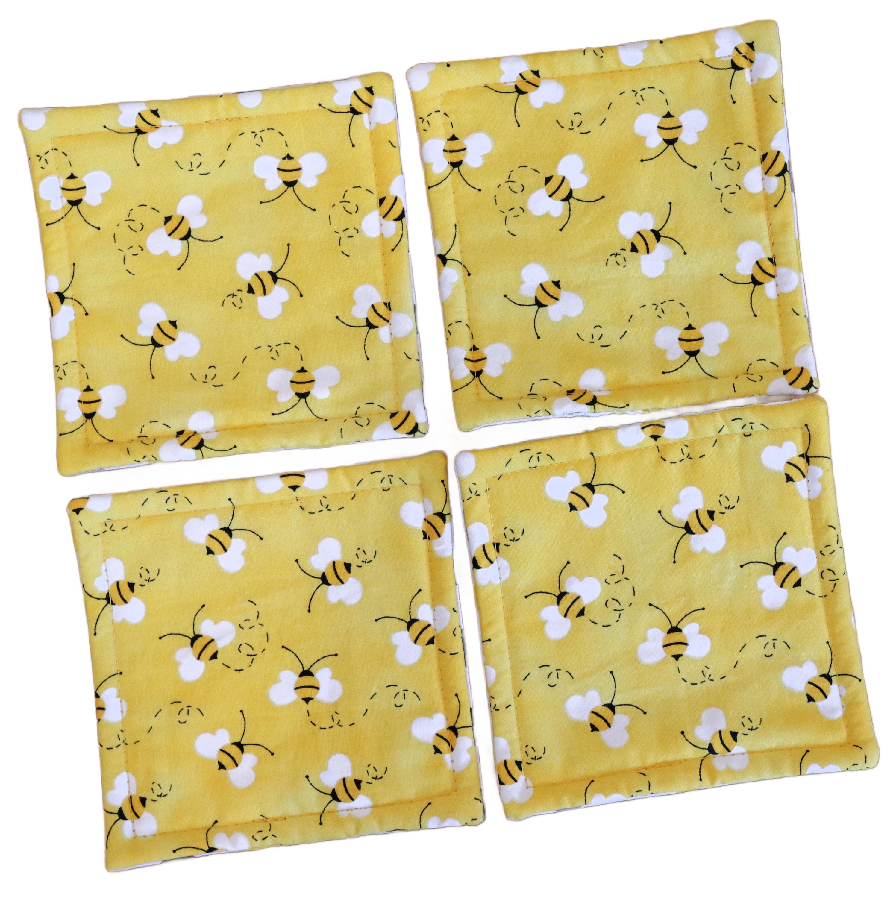 These beautiful set of 4 coasters are made with cotton fabric with Sweet Bees and backed with black and white and gray dots. These coasters measure 4 1/2" by 4 1/2". They are lined with Warm & Natural batting and are quilted to be absorbent. These make lovely stocking stuffers or a wonderful hostess gift for those upcoming holiday parties. Machine wash & dry. Press with iron if necessary.
