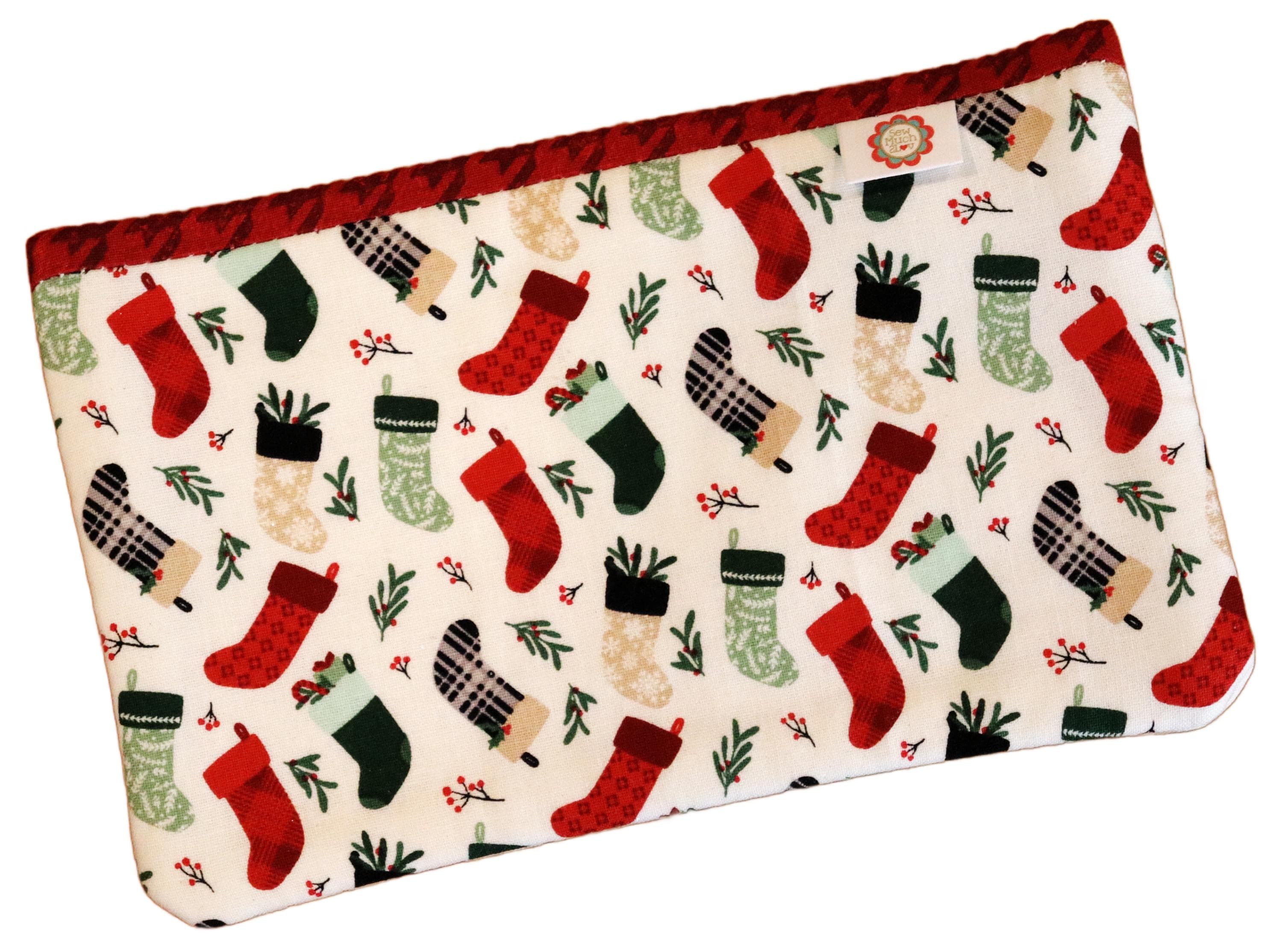 These cute little zipper bags measure approximately 7 1/2" wide by 4 1/2" tall and are a great size to hold your scissors, needles, floss and accessories. They also make great make-up bags.