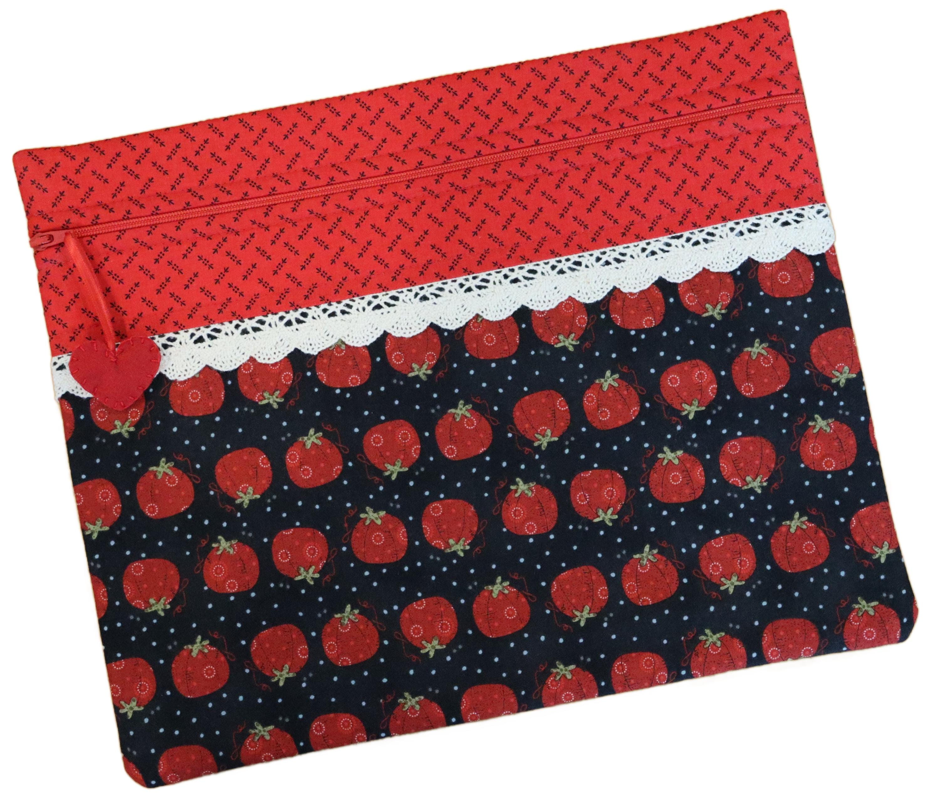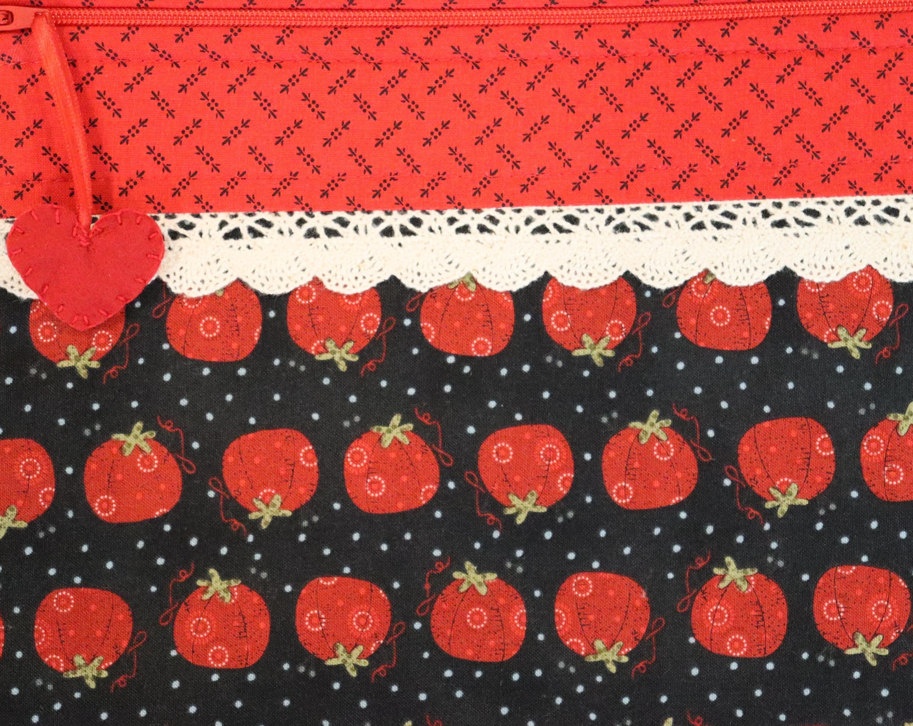 These bags are perfect for projects to take along with you as well as all kinds of crafts that you want to keep clean and away from sticky fingers or curious pets. They measure 10.5" by 13" and are padded and fully lined. Each one has a hand stitched wool felt heart for the zipper pull.