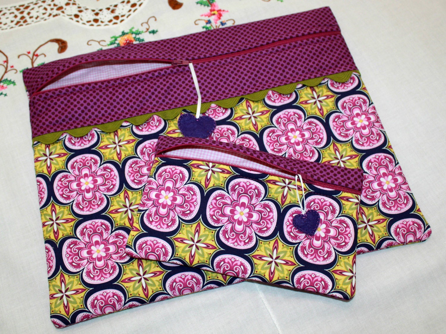 A few years ago my beloved dog, decided that after almost 5 years in my home, he wanted to eat my cross stitch supplies while I wasn't looking. He'd never done it before. But I guess it just looked yummy all of a sudden. So after he ate some over-dyed floss and hand-made buttons I decided to make myself a project bag to keep my supplies safe. Problem solved! These bags are perfect for projects to take along with you as well as all kinds of crafts that you want to keep clean and away from sticky fingers or curious pets. They measure 11" by 13 1/2" and are padded and fully lined. It will easliy hold your 8 x 8 Qsnap as well as your supplies. Each one has a hand stitched wool felt heart for the zipper pull.