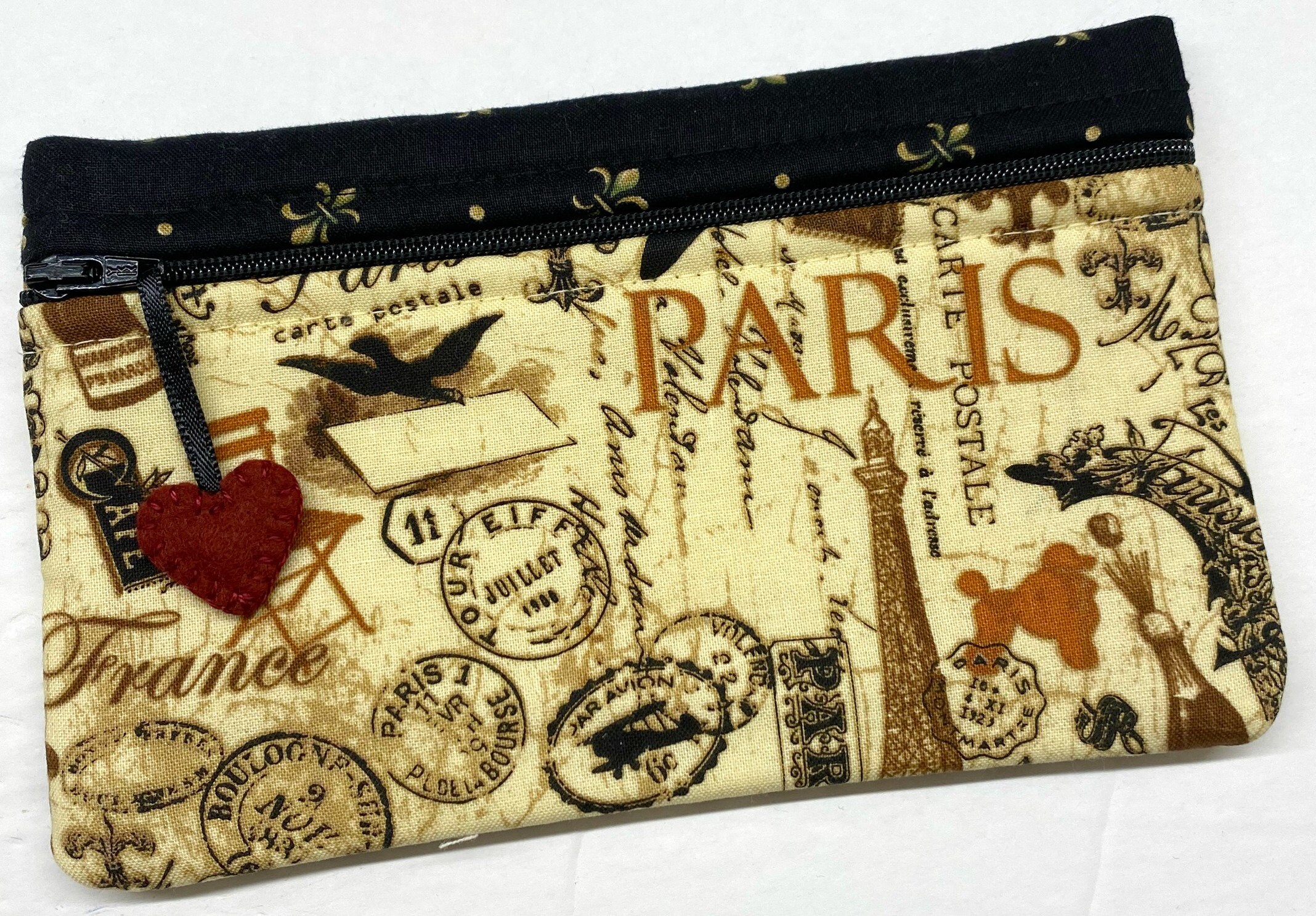 These cute little zipper bags measure approximately 7 1/2" wide by 4 1/2" tall and are a great size to hold your scissors, needles, floss and accessories. They also make great make-up bags.