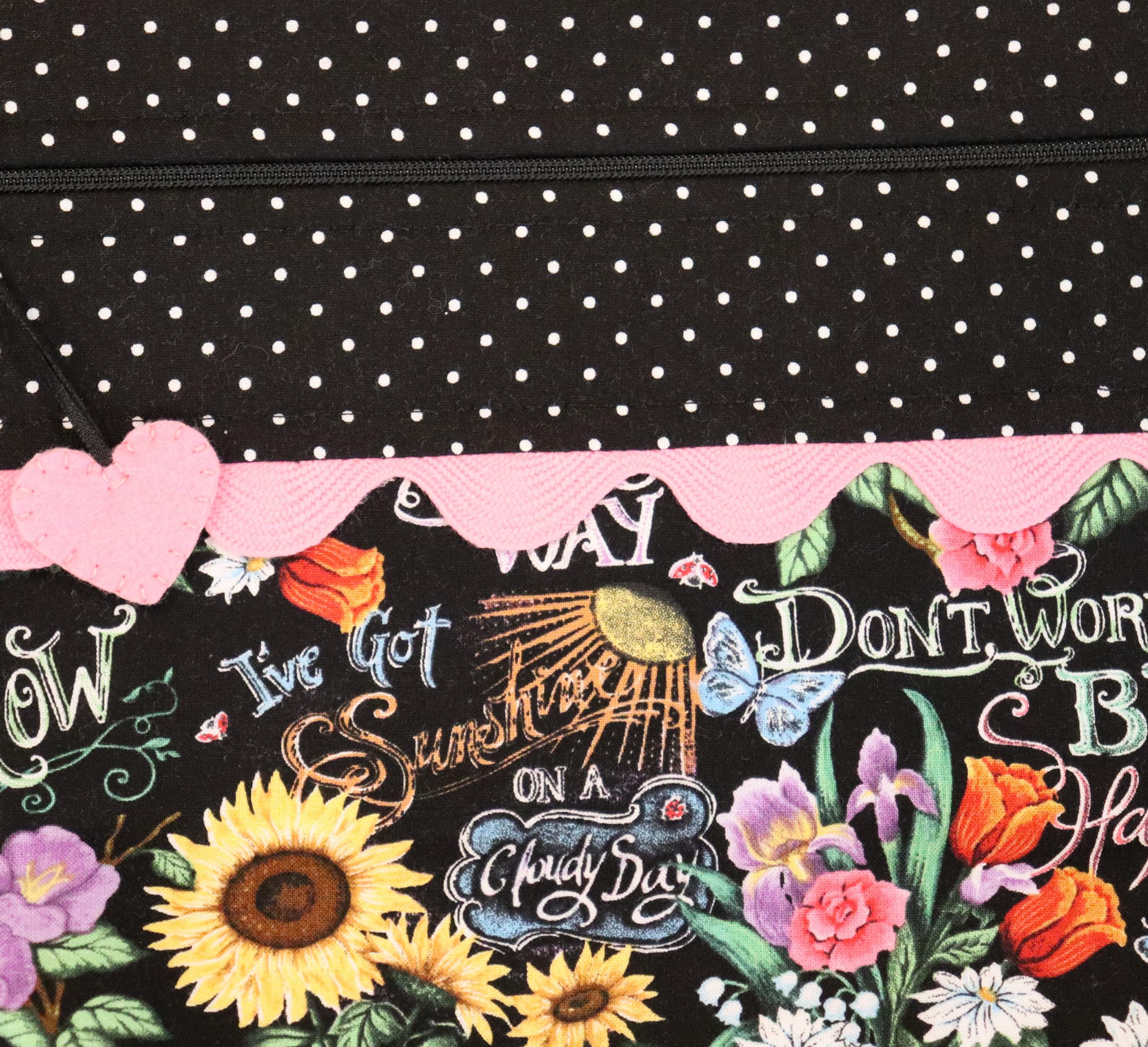 These bags are perfect for projects to take along with you as well as all kinds of crafts that you want to keep clean and away from sticky fingers or curious pets. These bags are padded and fully lined. Each one has a hand stitched wool felt heart for the zipper pull.